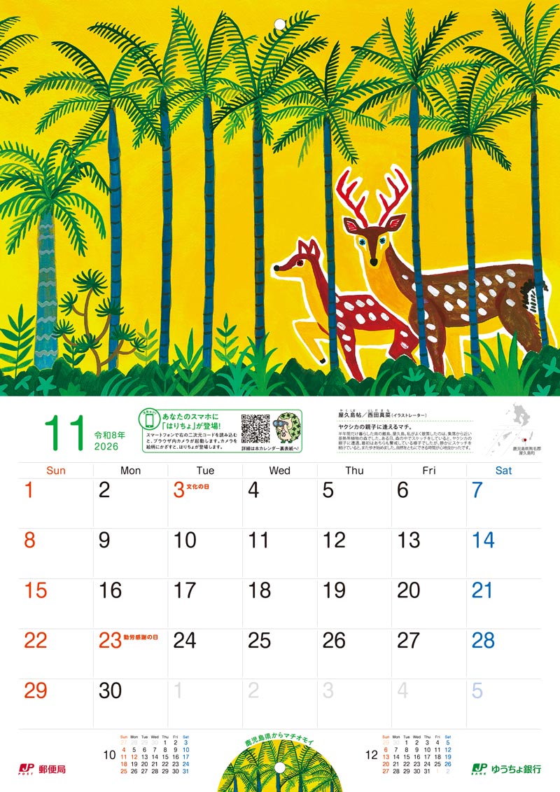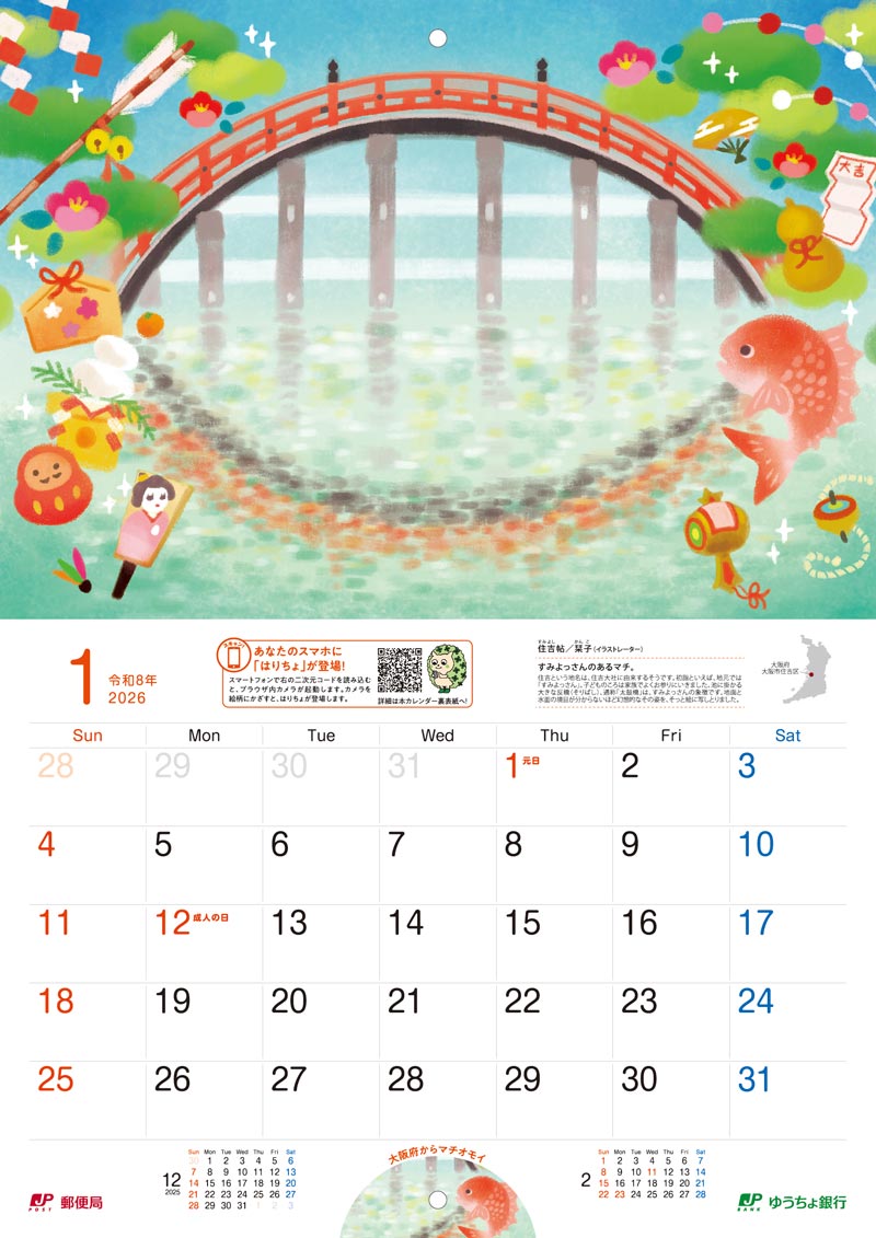 ご縁あり暮らし始めた町で、1000年以上も続いている「御嵩薬師祭礼」の様子を描きました。ローカルなお祭りですが、毎年4月の第一日曜日と決まっていて、桜が綺麗なときもあれば、早く散ってしまうと桜がないときもあるので、毎年、桜が美しい時期になりますようにという願いも込めて、桜を背景に入れました。カレンダーが出来上がった後、近所の人から「見たよ!」と声を掛けてもらったり、離れて暮らす両親からも「郵便局行ってきた!」と連絡を貰いました。遠方の知人から、山形県のご実家にあったカレンダーを「何気なくみてたら載ってたからびっくりしたよ!」と連絡をもらったりして、全国配布されたことを実感しました。一緒に掲載された御嵩町の郵便局の人たちも喜んでくれました。 美しい自然と動物、人が混ざり合ったこの場所を大切にしたいです。カレンダーをきっかけに、地元の宇都宮中央郵便局様で約1か月もの間、掲載記念としてイラストの展示をして下さいました。これからも、イラストレーションを通してその地域の人の魅力や文化を伝えられるような仕事ができたらと思います。